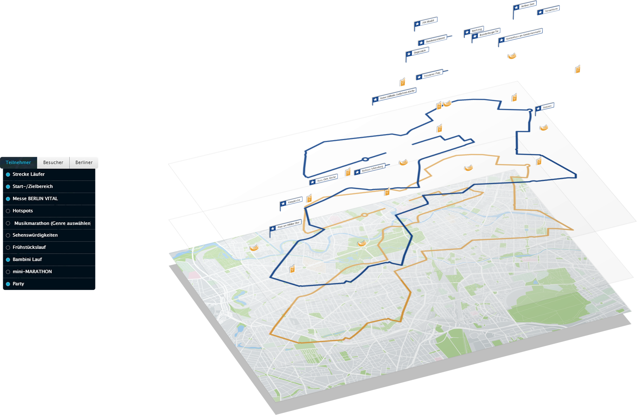 With almost 50,000 participants and over a million spectators, the BMW BERLIN-MARATHON is one of the biggest marathon events in the world. To ensure that all these people don't just have to use a colourful folded map to find their way around Berlin, the existing interactive route map was completely revamped for the anniversary.