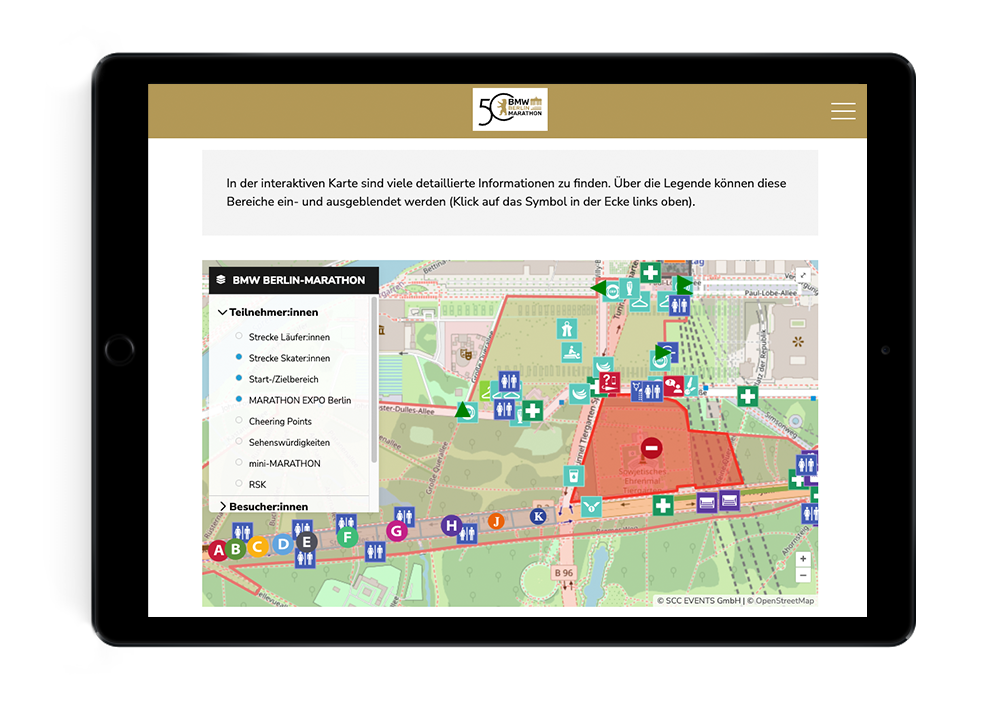 For the 50th BMW BERLIN-MARATHON, bytepark created an interactive map of the marathon course and other running routes for SCC EVENTS. The editors of SCC EVENTS now have an editor tool that allows them to change the map content at their own convenience.