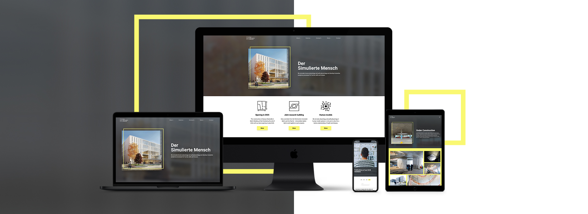 The requirement was not only to make visible how construction of the building is progressing, but also to show what is happening in the research groups. The content structure for presenting research groups, events and other special features of the facility were outlined in wireframes. The entire UX process from the sitemap to the finished wireframes was developed in joint workshops (requirements and target groups, sitemap, wireframes, look & feel, design).