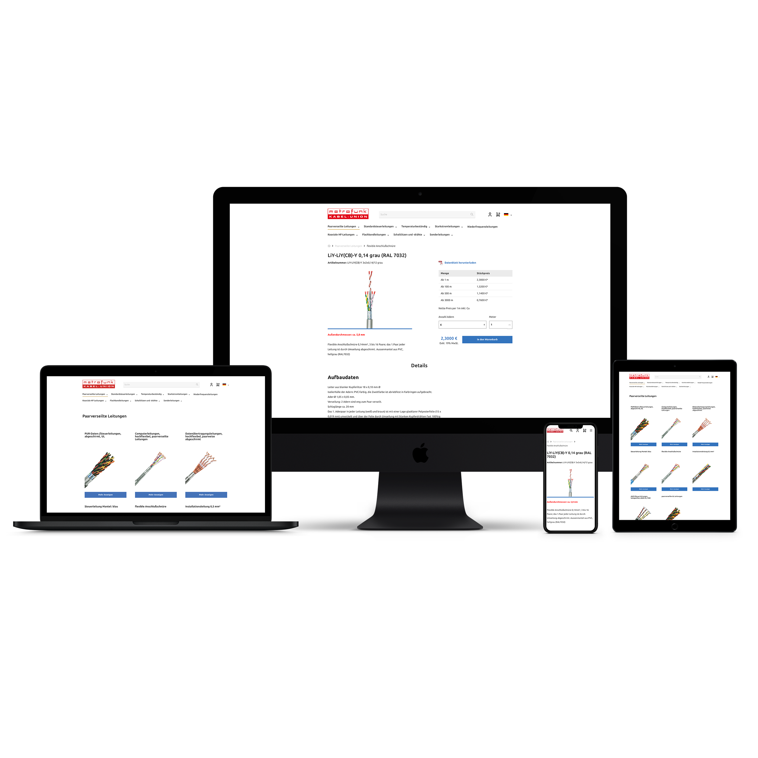Wir freuen uns, den Relaunch des Onlineshops für unseren langjährigen Kunden Metrofunk abgeschlossen zu haben. Metrofunk produziert und bevorratet mehr als 2.500 verschiedene Leitungen, Litzen und Drähte und verkauft diese weltweit. Klare Angebotsaussagen, feste, nach Abnahmemengen gestaffelte Preise und prompte Lieferung zu günstigen Bedingungen gehören für Metrofunk zum Kundenservice.